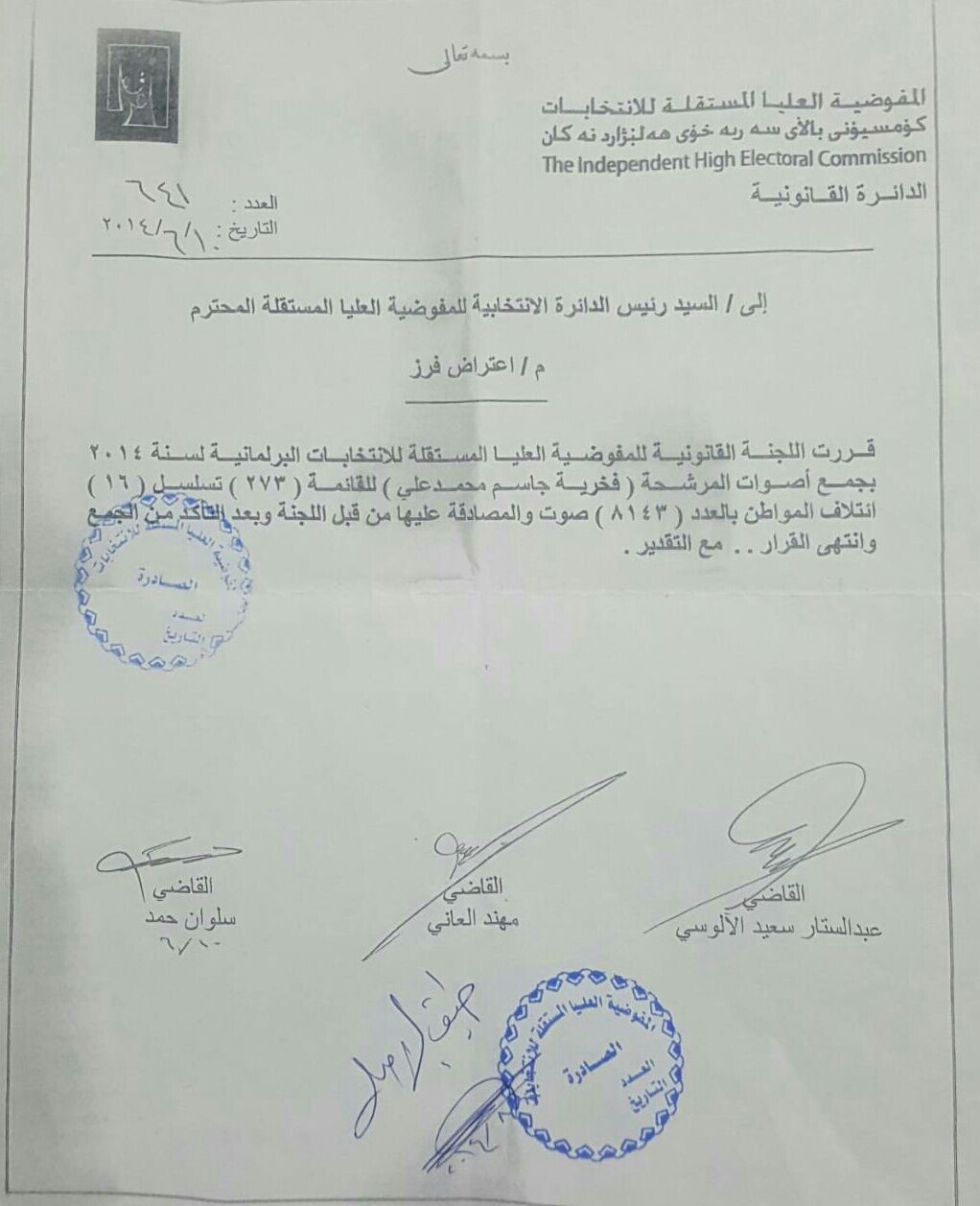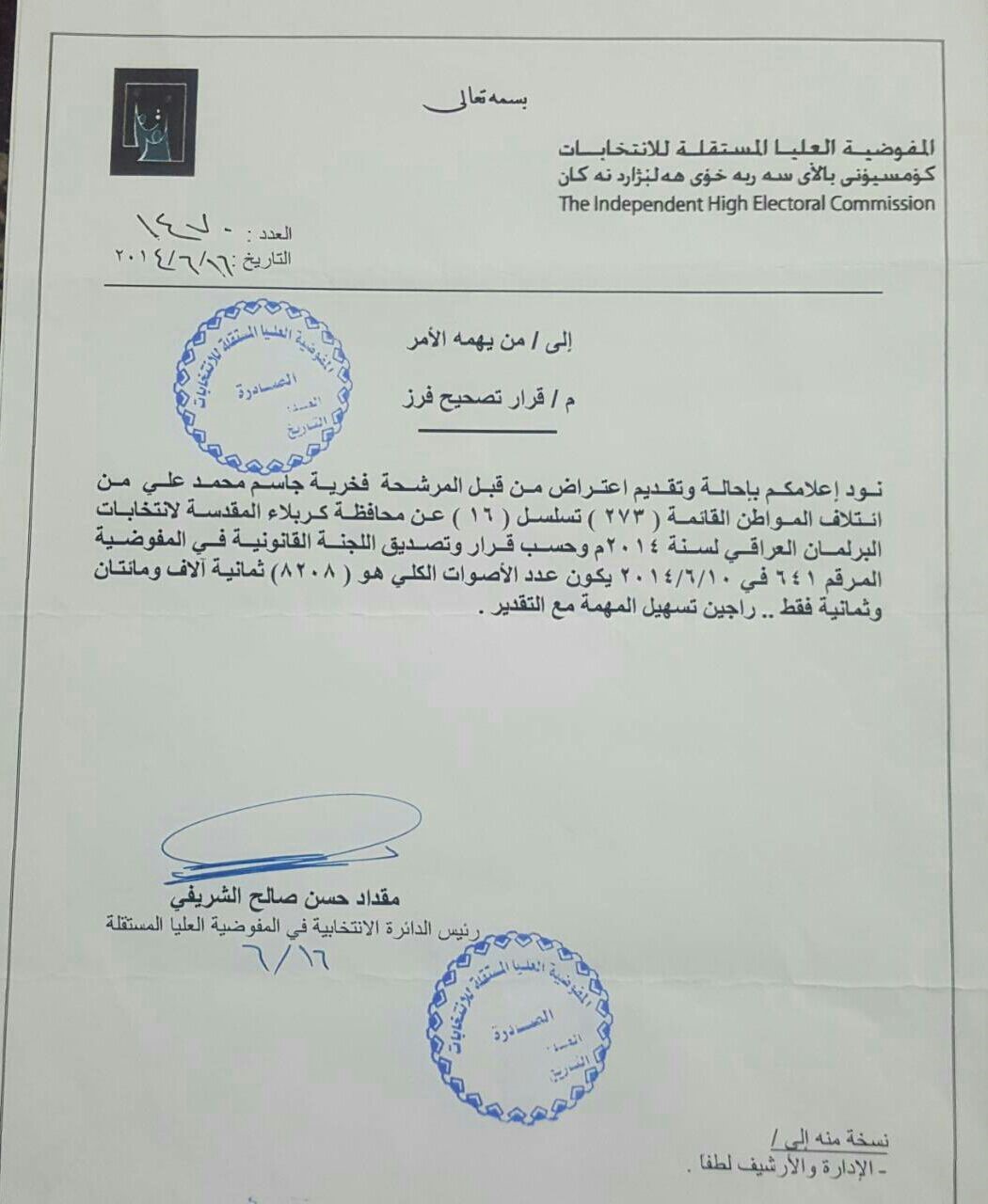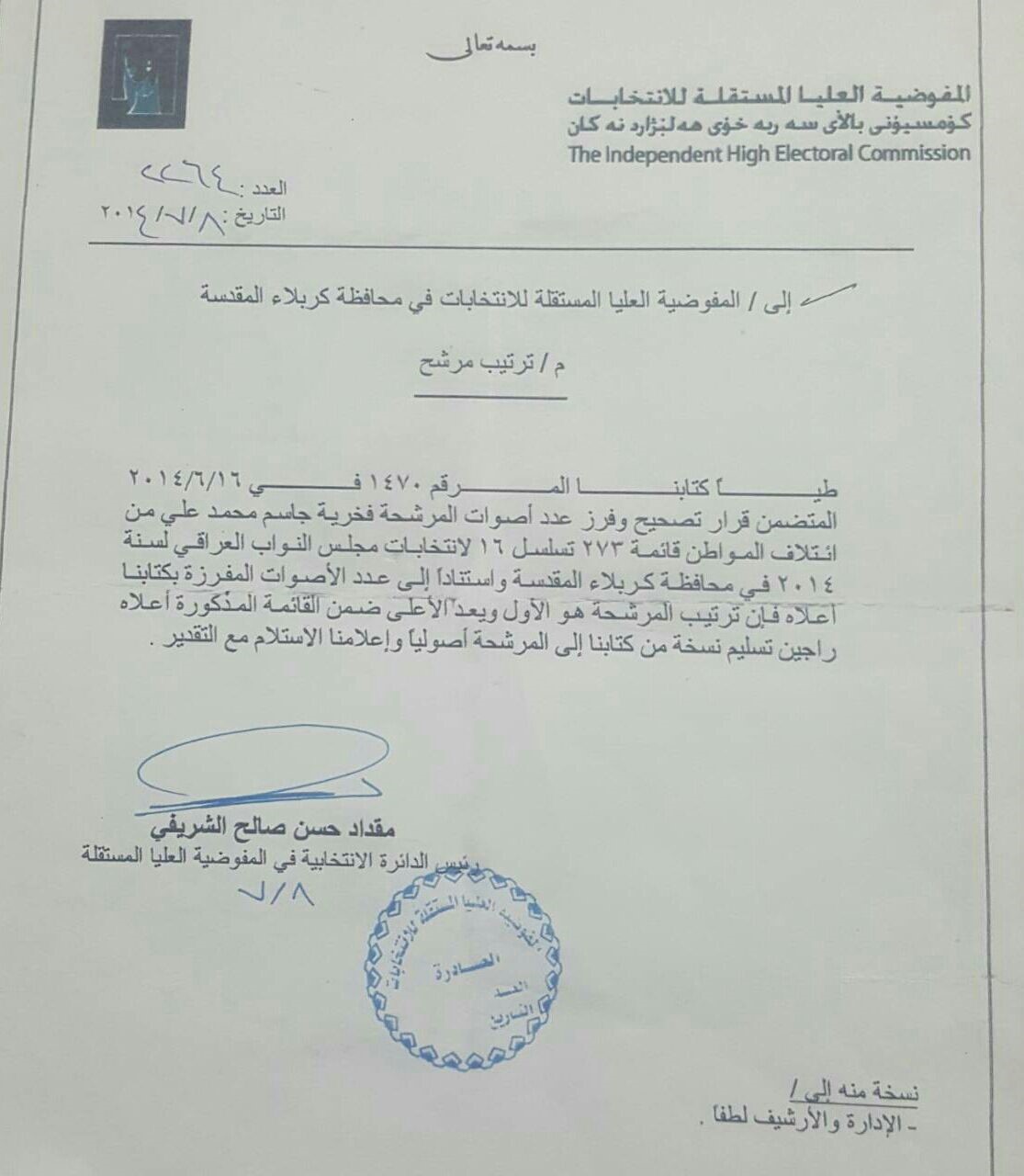 وبحسب الوثائق الثلاث الصادرة عن المفوضية العليا للانتخابات فانها تبين باحقية المرشحة المهندسة فخرية جاسم محمد علي بالمقعد البرلماني على اعتبار انها حصلت على اعلى الاصوات