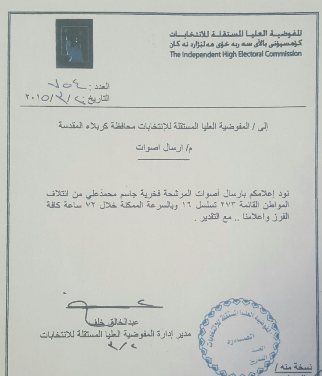 اما الوثيقة الاخرى فتبين ان مدير ادارة المفوضية العليا المستقلة للانتخابات عبد الخالق خلف قد ارسل كتاب الذي يحمل العدد 754 بتاريخ 2 / 3 / 2015 يعلم المفوضية بارسال اصوات المرشحة فخرية جاسم محمد علي من ائتلاف الموطن وبالسرعة الممكنة خلال 72 ساعة