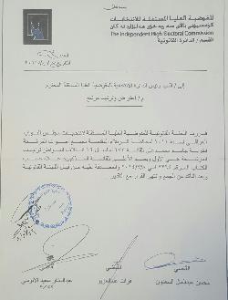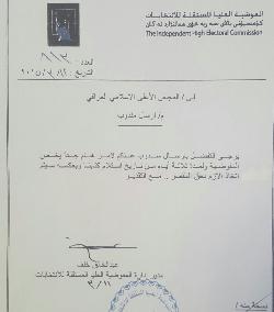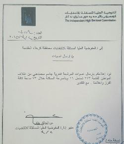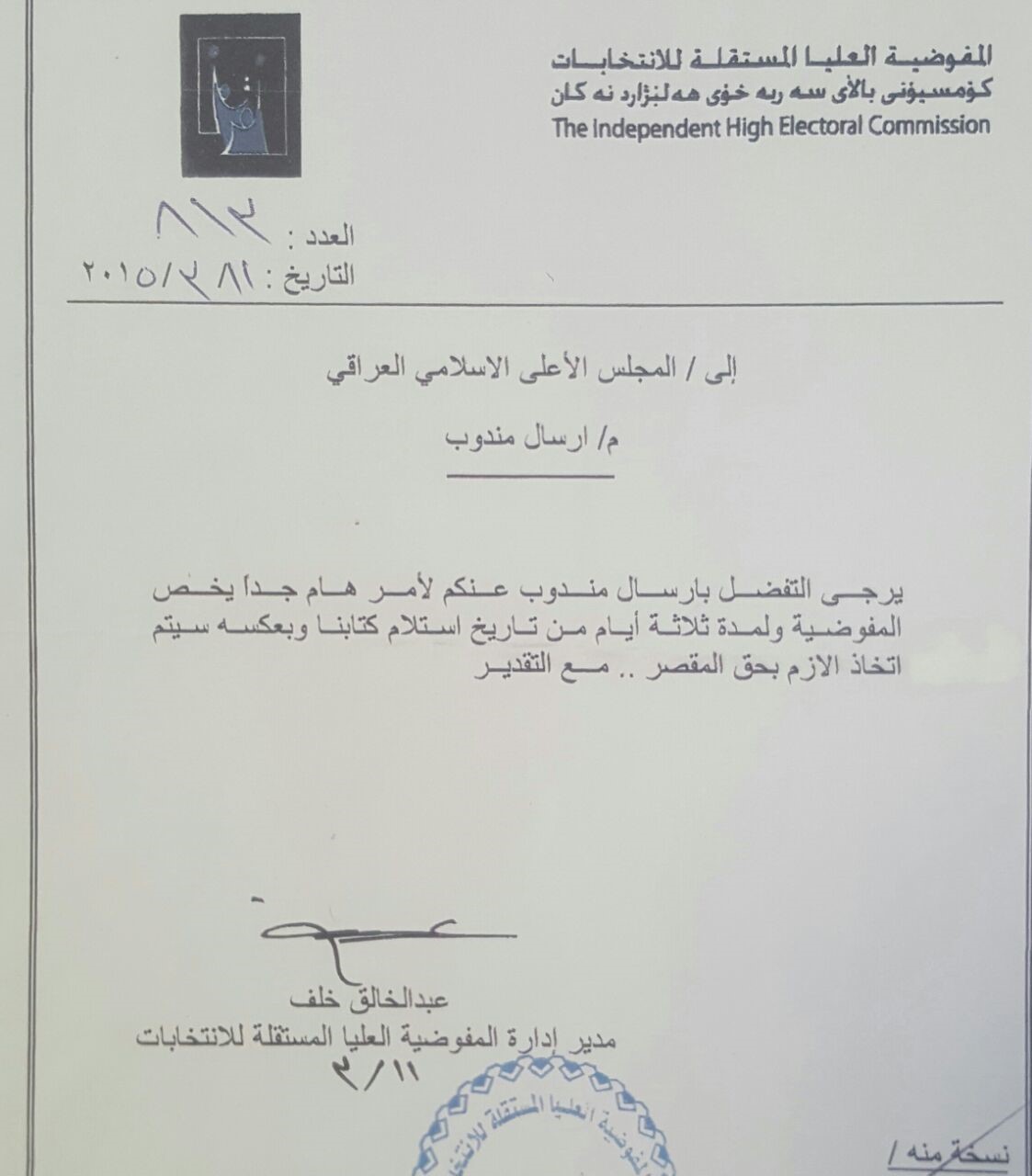 اما الوثيقة التالية فتبين ان المفوضية العليا المستقلة للانتخابات تطالب المجلس الاعلى الاسلامي العراقي الذي كان يتراسه انذاك عمار الحكيم بارسال مندوب عن المجلس الاعلى خلال ثلاثة ايام من تاريخ استلام كتاب المفوضية وبعكسه سيتم اتخاذ القرار المناسب بحق المقصر