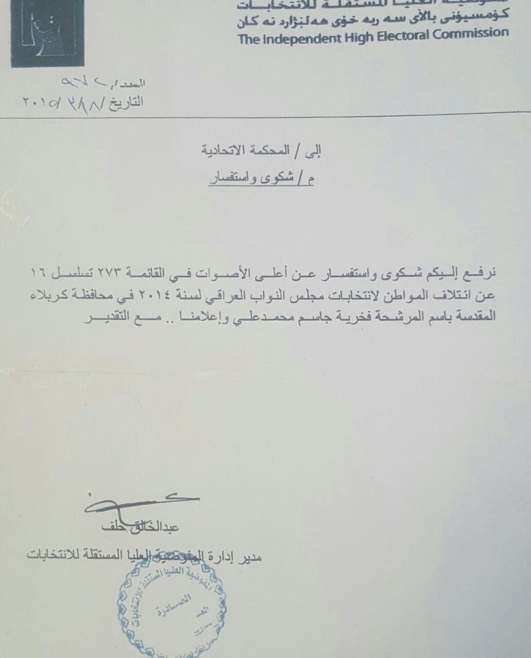 اما الوثيقة الاخيرة فتبين ان المفوضية العليا المستقلة للانتخابات ارسلت كتابا الى المحكمة الاتحادية تحت عنوان شكوى واستفسار عن اعلى الاصوات في القائمة 273 عن محافظة كربلاء المقدسة المقدمة باسم فخرية جاسم محمد علي