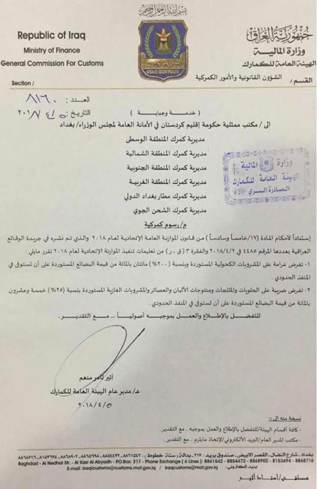 وبموجب وثيقة فان الهيئة العامة للكمارك وتنفيذا لبنود موازنة ٢٠١٨ قررت فرض غرامة ٢٠٠٪ على المشروبات الكحولية المستوردة.