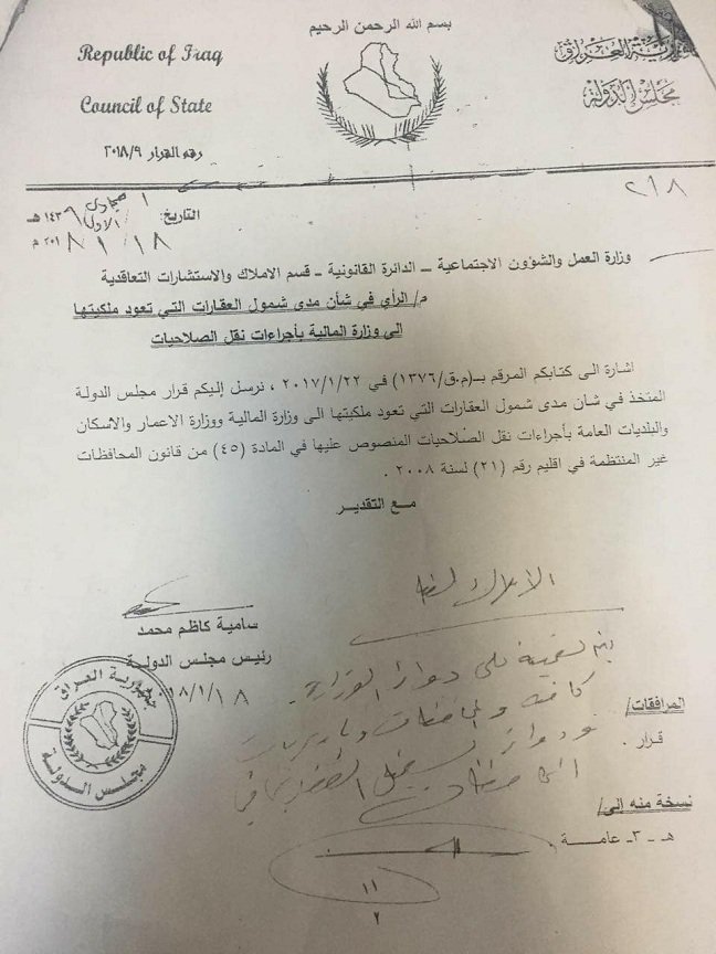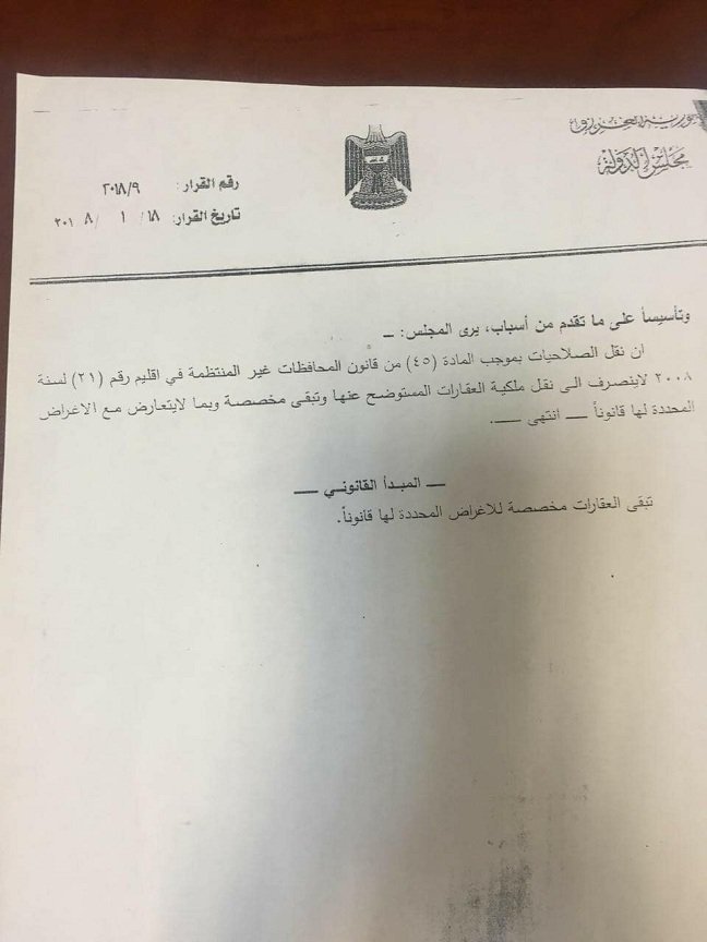 وجاء في نص الكتاب إن "اشارة الى كتابكم المرقم بـ(م.ق/1376) في 22/1/2017 ، نرسل اليكم قرار ملس الدولة المتخذ في شأن مدى شمول العقارات التي تعود ملكيتها الى وزارة المالية ووزارة الاعمار والاسكان والبلديات العامة باجراء نقل الصلاحيات المنصوص عليها في المادة (45) من قانون المحافظات غير المنتظمة في اقليم رقم (21) لسنة 2008".