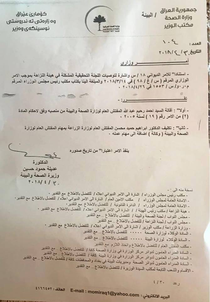 بالوثيقة ..بعد ادانته بالفساد اقالة مفتش عام وزارة الصحة وتعيين اخر