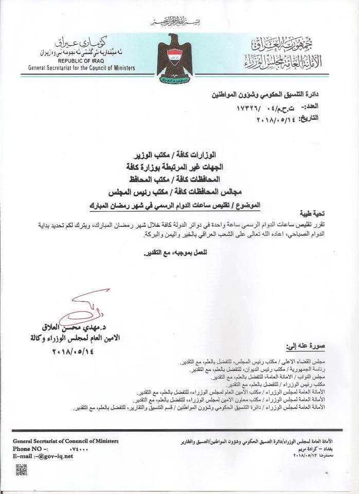 وجاء في وثيقة انه "تقرر تقليص ساعات الدوام الرسمي ساعة واحدة في دوائر الدولة كافة خلال شهر رمضان المبارك، ويترك لكم تحديد بداية الدوام الصباحي".