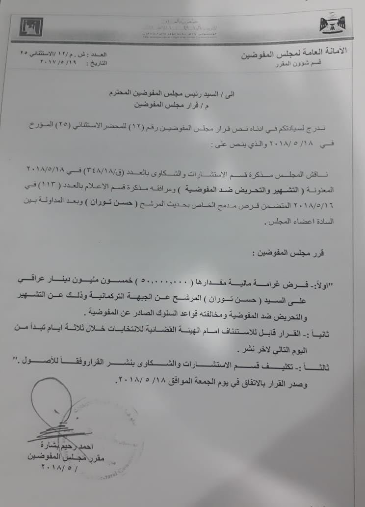 هذه وثيقة تتضمن فرض مفوضية الانتخابات غرامة بحق المرشح عن الجبهة التركمانية حسن توران بمبلغ 50 مليون دينار بتهمة التشهير والتحريض ضد المفوضية.