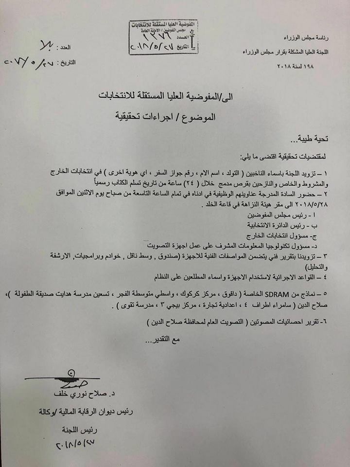 واضافت الوثيقة انه "على رئيس مجلس المفوضين ورئيس الدائر الانتخابية ومسؤول انتخابات الخارج ومسؤول تكنولوجيا المعلومات المشرف على عمل اجهزة التصويت، الحضور الى مقهر هيئة النزاهة في قاعة الخلد.