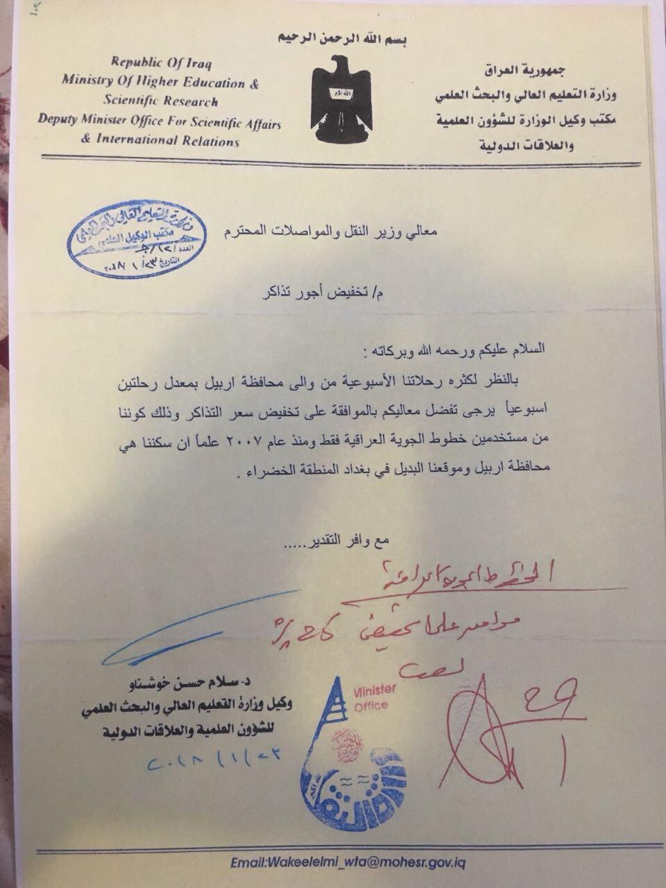 وجاء في نص الوثيقة الموجهة الى وزير النقل كاظم الحمامي بموضوع [تخفيض أجور تذاكر]، "بالنظر لكثرة رحلاتنا الأسبوعية من والى محافظة أربيل بمعدل رحلتين أسبوعيا يرجى تفضلكم بالموافقة على تخفيض سعر التذاكر وذلك كوننا من مستخدمي الخطوط الجوية العراقية فقط ومنذ عام 2007".