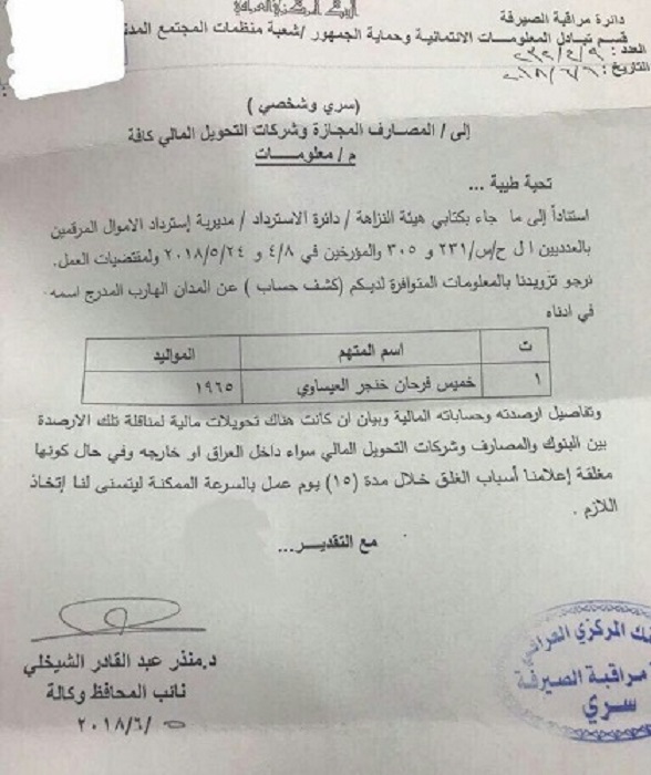 وأظهر كتاب سري اليوم ، أن” “النزاهة/ دائرة استرداد الأموال، والبنك المركزي العراقي، تطالب المصارف المجازة وشركات التحويل المالي بتزويده بمعلومات عن خميس الخنجر وتفاصيل أرصدته وحساباته المالية”