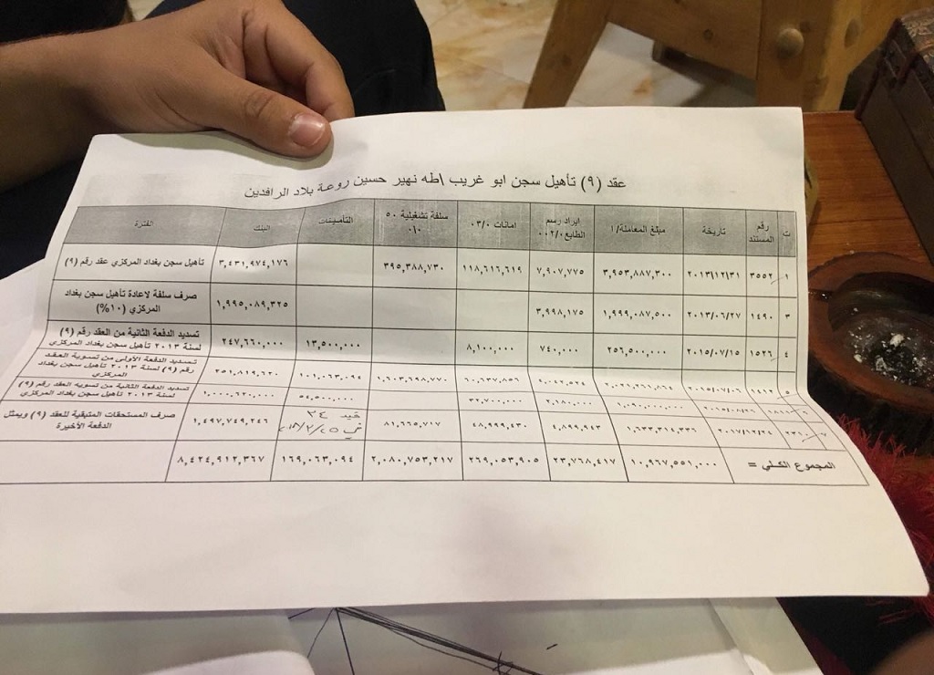 ووفقا للكتب فان تكلفة تأهيل سجن بغداد المركزي اي مايعرف 'بسجن ابو غريب' تقدر بثلاثة مليار ونصف دينار عراقي ،