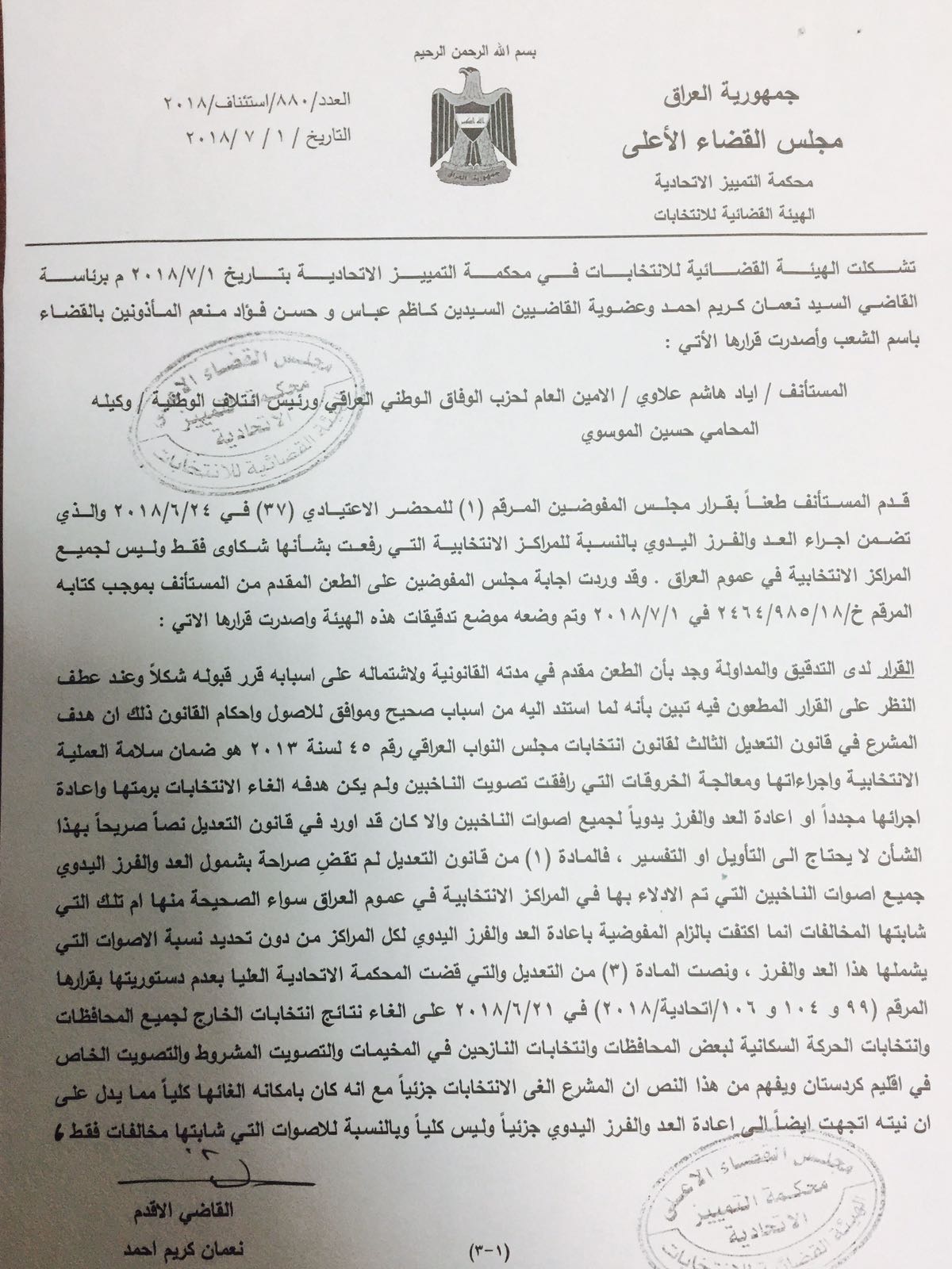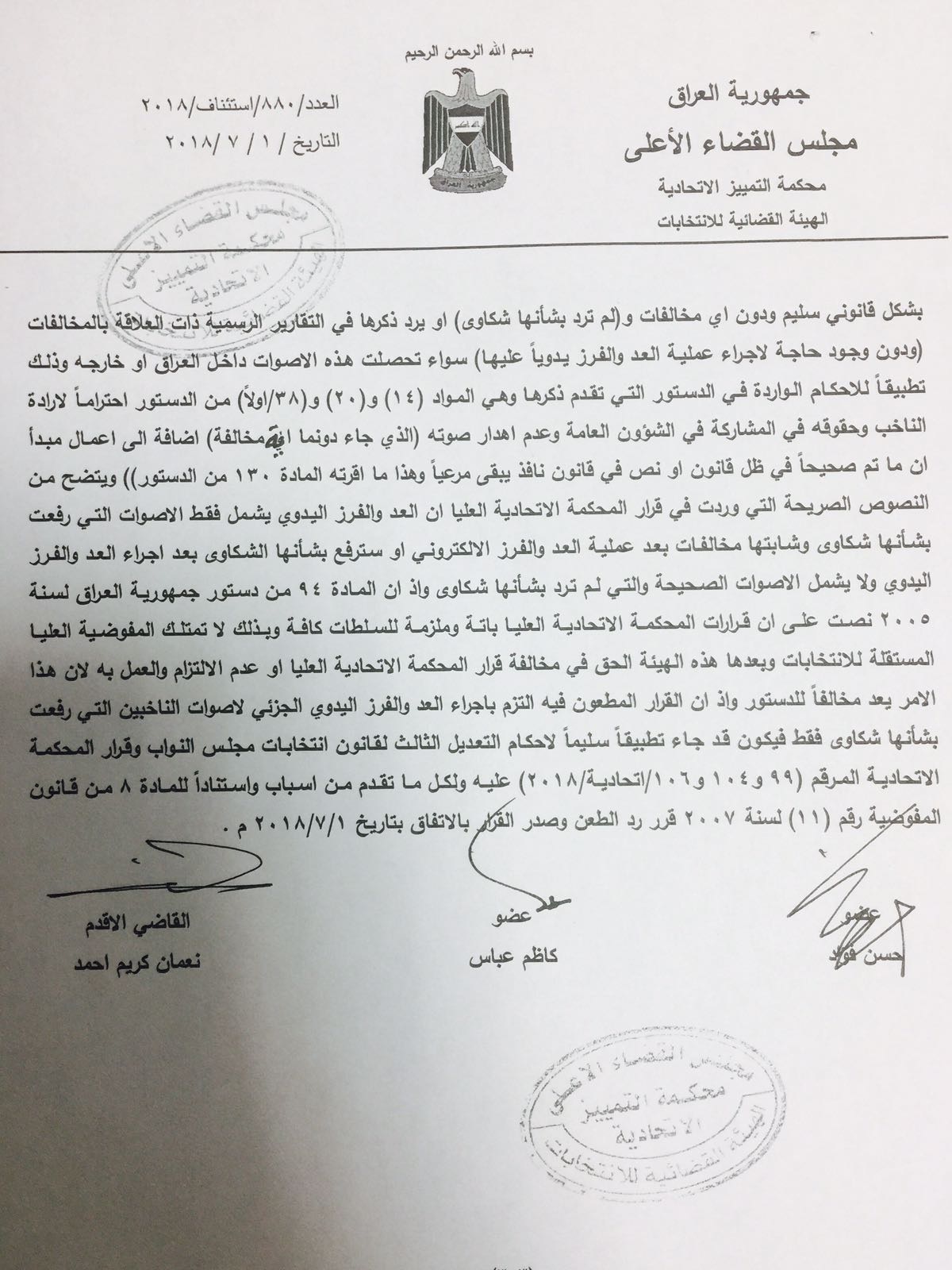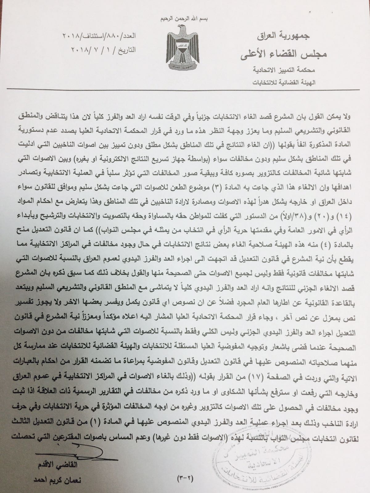 أصدرت الهيئة القضائية للانتخابات في محكمة التمييز الاتحادية قرارا بتاريخ ١ تموز ٢٠١٨ يقضي بتأييد قرار المفوضية العليا المستقلة للانتخابات بخصوص العد و الفرز اليدوي.