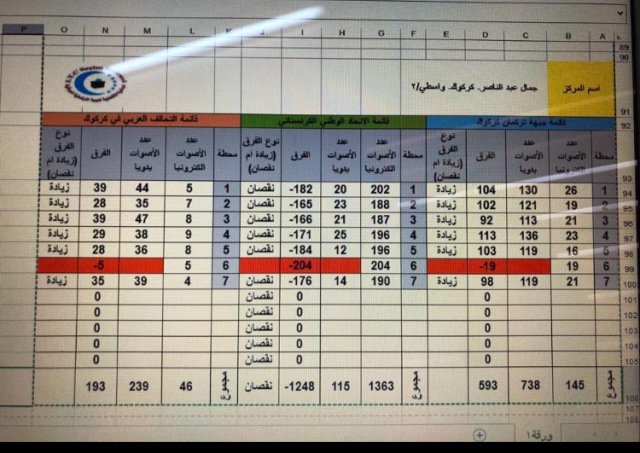اعلن مسؤول الدائرة الانتخابية في الجبهة التركمانية العراقية احمد رمزي، الخميس، ان العد والفرز اليدوي لمركزين انتخابيين في محافظة كركوك اظهر تقدما للتركمان والعرب، فيما نقص اصوات قائمة الاتحاد الوطني حسب نتائج العد والفرز.
