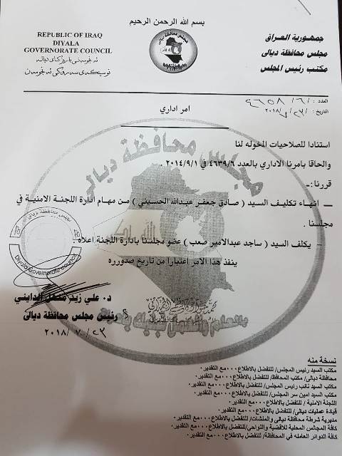 تم الكشف عن وثيقة رسمية تنهي تكليف صادق الحسيني لرئاسة اللجنة الأمنية في مجلس ديالى.