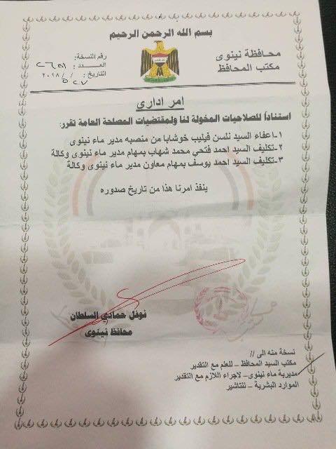 وذكرت الوثيقة إنه "استنادا للصلاحيات المخولة ولمقتضيات الحاجة تقرر إعفاء نلسن قيليب خوشابا من منصبه مدير ماء نينوى، وتكليف احمد فتحي محمد شهاب بمهام مدير نينوى/وكالة