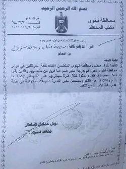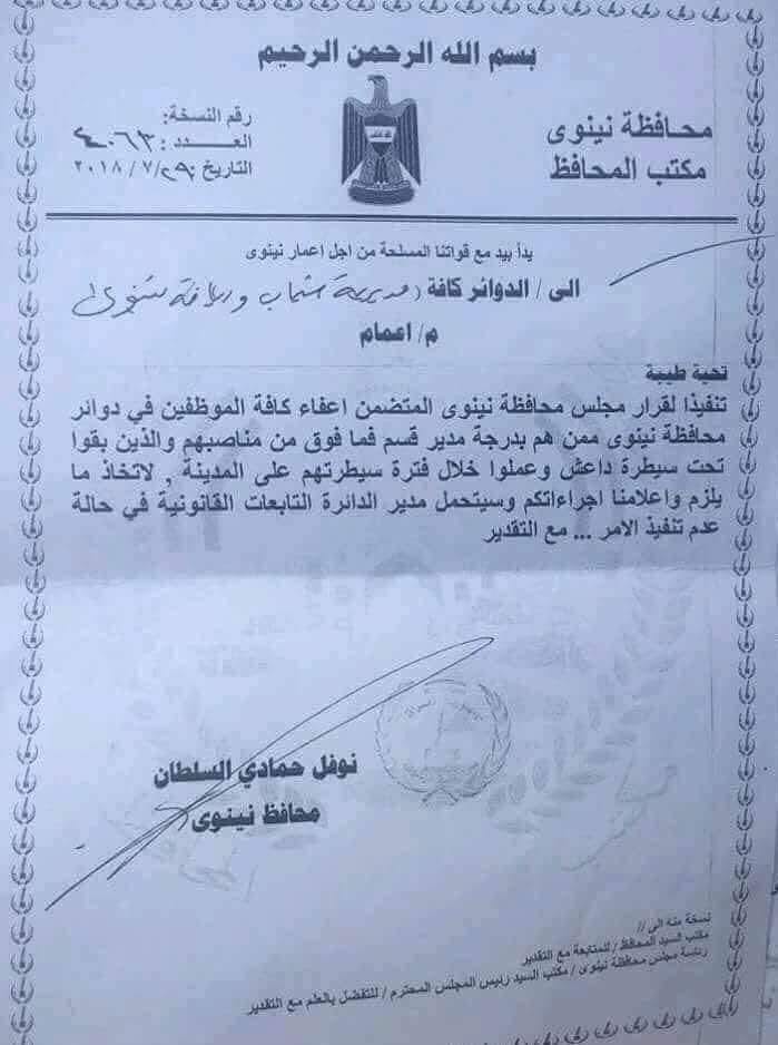 كشفت وثيقة صادرة من مكتب محافظ نينوى، نوفل حمادي العاكوب بتاريخ 27 أيار 2018، عن صدور امر إداري بتكليف احمد فتحي شهاب بمهام مدير ماء نينوى/وكالة وهو أحد المنتمين لعناصر داعش الارهابي، بحسب وثيقة بينت أنه كان يشغل أحد المسؤولين فيما يسمى بديوان الخدمات لما يعرف بـ"ولاية نينوى".