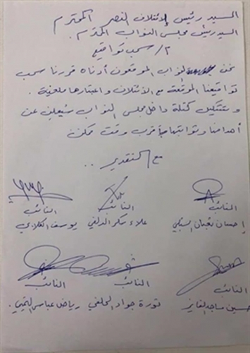 وتحمل الرسالة تواقيع كل من النائب [احسان ثعبان الشبلي و علاء سكر الدلفي ويوسف الكلابي و حسين ساجد الفايز و نورة جواد الحلفي و رياض عباس التميمي].