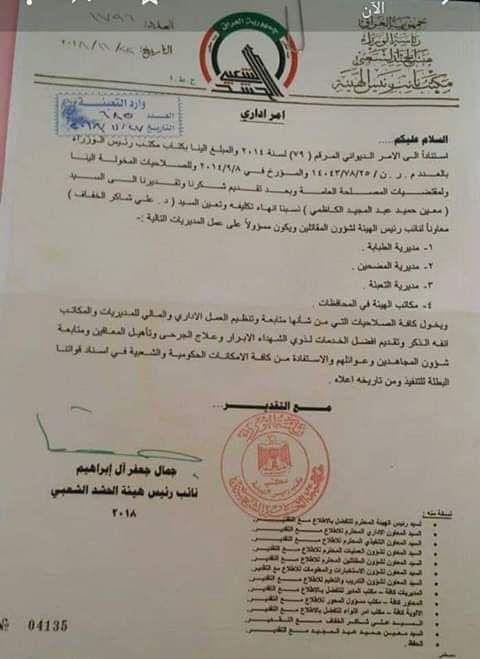 بالوثيقة.. ابو مهدي المهندس ينهي تكليف معين الكاظمي ويعين د. علي شاكر الخفاف خلفاً له