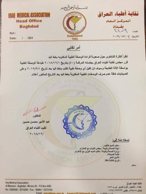 وهذه وثيقة صادرة من نقابة الاطباء قرر فيها مجلس النقابة بجلسته التي عقدت بتاريخ 1 كانون الاول 2018 طباعة الوصفة الطبية بواسطة الالة الطابعة، واشارت الى ان القرار جاء بسبب كثرة الشكاوى الواردة بشأن صعوبة قراءة الوصفة المكتوبة بخط اليد.
