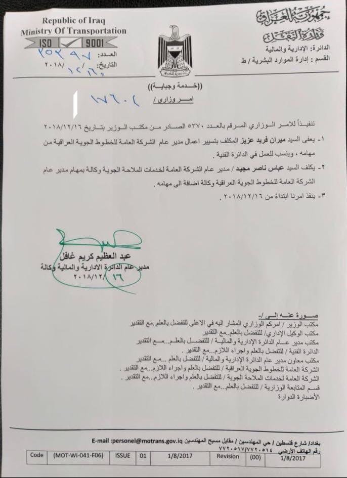 تم نشر وثيقة صادرة من وزارة النقل تضمنت فيها اعفاء مدير عام الشركة العامة للخطوط الجوية العراقية ميران فريد من مهامه.