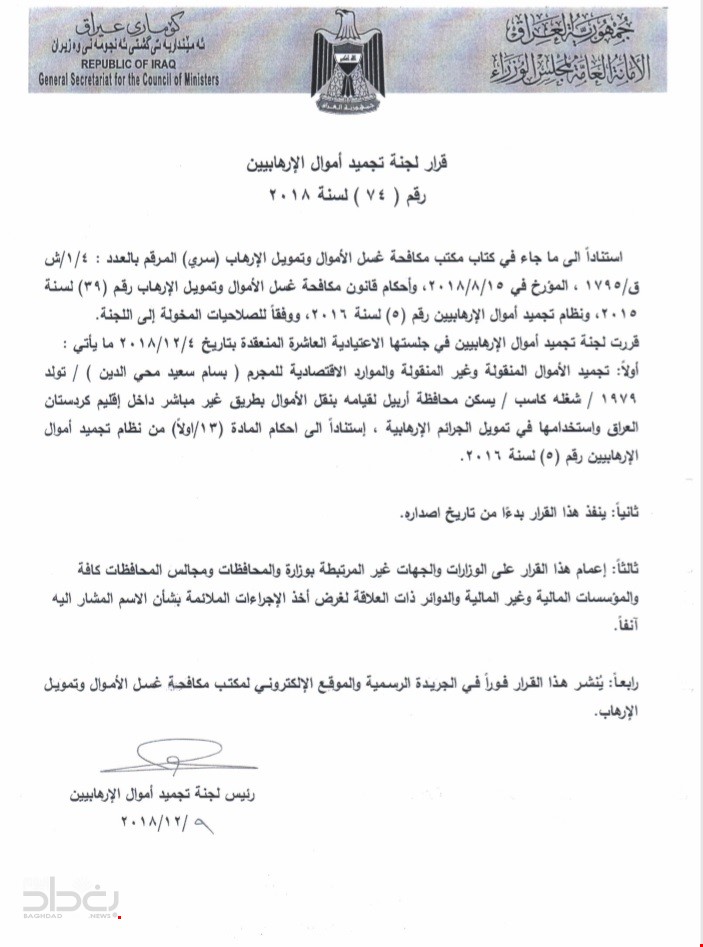 ونصت وثيقة صادرة من اللجنة على أن "اللجنة قررت تجميد الأموال المنقولة وغير المنقولة والموارد الاقتصادية للمجرم ( بسام سعيد محي الدين )، تولد 1979/ شغله كاسب / يسكن محافظة أربيل، لقيامه بنقل الأموال بطريق غير مباشر داخل إقليم كردستان العراق واستخدامها في تمويل الجرائم الإرهابية، إستنادا الى احكام المادة (13/اولاً) من نظام تجميد أموال الإرهابيين رقم (5) لسنة 2016".