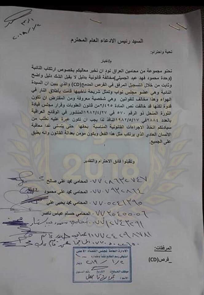 بالوثيقة .. سبع محامين يتحركون لمقاضاة النائبة " وحدة الجميلي"