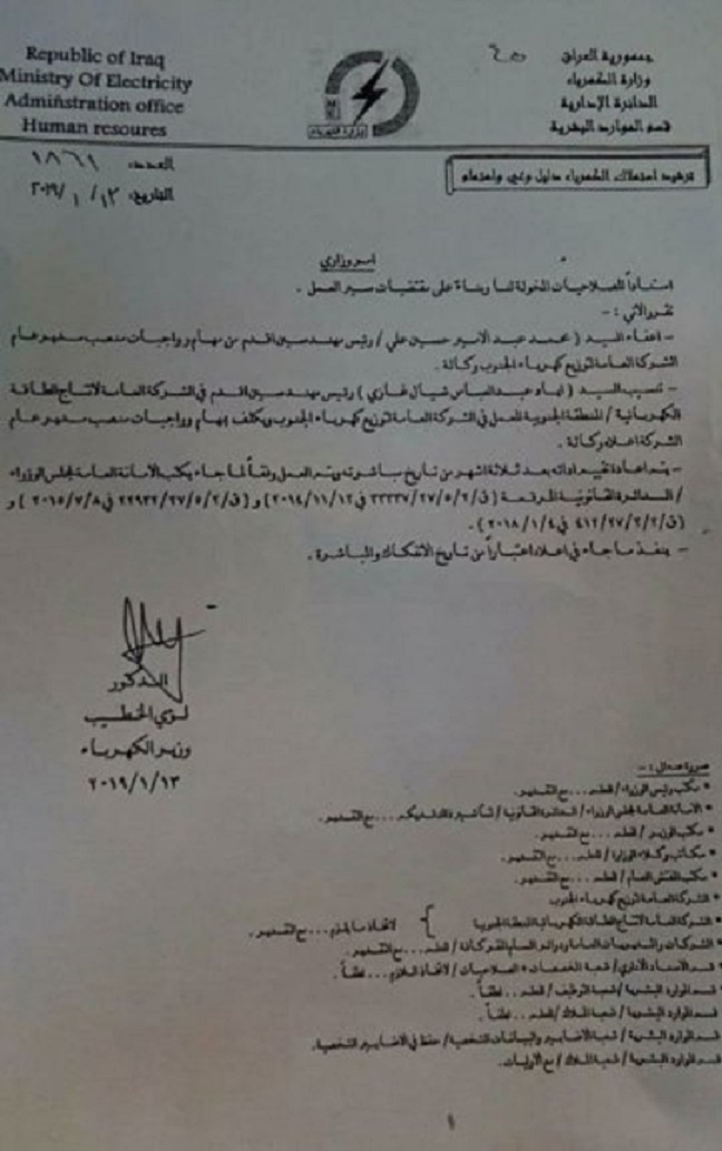 بالوثيقة .. اعفاء مدير عام توزيع الكهرباء في الجنوب