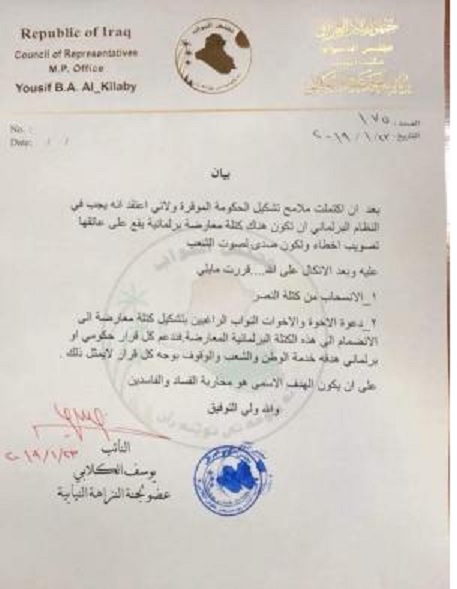 بالوثيقة.. نائب يعلن انسحابه من تحالف النصر ويكشف الاسباب