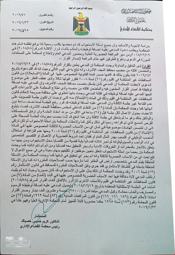 نص قرار محكمة القضاء الاداري، المتضمن إعادة محافظ النجف لؤي الياسري إلى منصبه ورد إقالته.