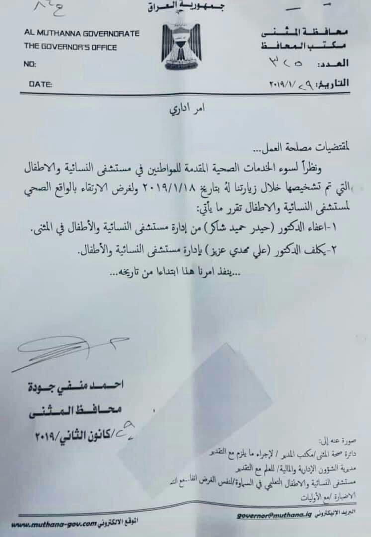 نشرت وثيقة تفيد باعفاء محافظ المثنى احمد منفي، مدير مستشفى النسائية والاطفال (حيدر حميد شاكر) من منصبه نظرا لسوء الخدمات الصحية، وتكليف علي مهدي عزيز بادارة المستشفى.