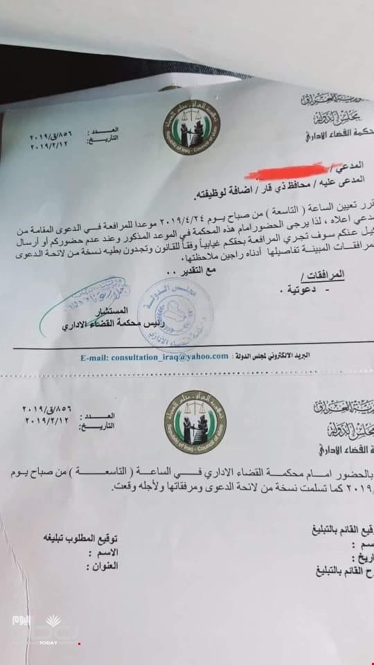 هذه وثيقة صادرة من مجلس الدولة/ محكمة القضاء الاداري، بموجبها تم رفع دعوى قضائية ضد محافظ ذي قار يحيى الناصري، بسبب التعيينات.