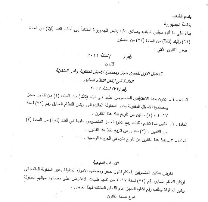 أنهى مجلس النواب، امس الاحد، القراءة الاولى لمشروع قانون التعديل الاول لقانون حجز ومصادرة الاموال المنقولة وغير المنقولة العائدة لاركان النظام السابق.