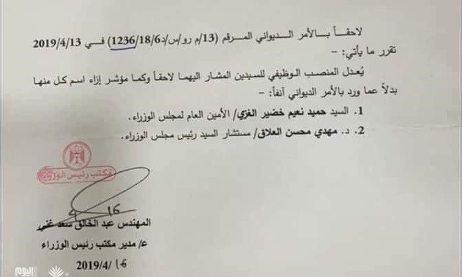 وتضمنت الوثيقة: "الحاقا بالامر الديواني المرقم (13/م ر و/س/د6/1236) في (13/4/2019)، تقررما يلي: