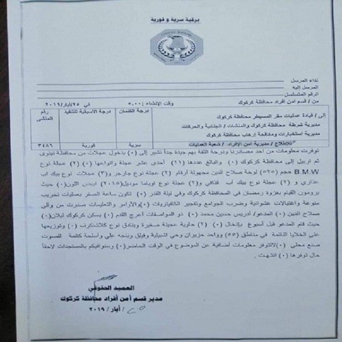 بالوثيقة.. عجلات متنوعة قادمة من اربيل الى كركوك للقيام بعملية غزوة رمضان