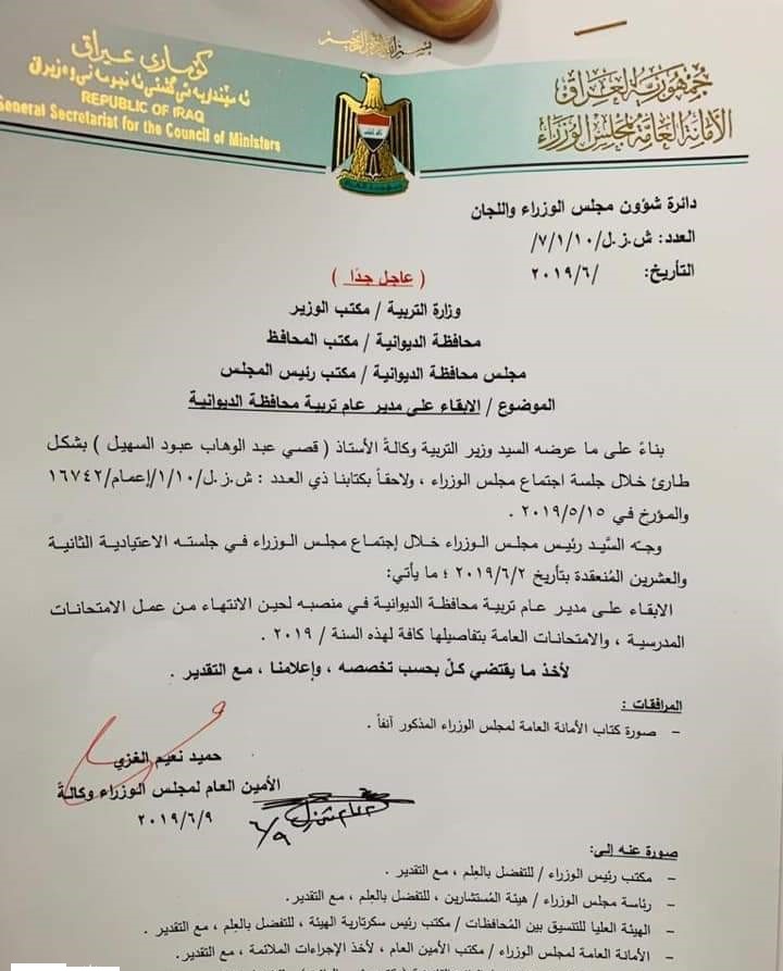 ووفقا لكتاب صادر عن الامانة: "بناءً على ماعرضه وزير التربية وكالة (قصي السهيل)، بشكل طارئ خلال جلسة اجتماع مجلس الوزراء، وجه رئيس مجلس الوزراء، بالابقاء على مدير تربية محافظة الديوانية، في منصبه لحين الانتهاء من عمل الامتحانات المدرسية، والامتحانات العامة بتفاصيلها".