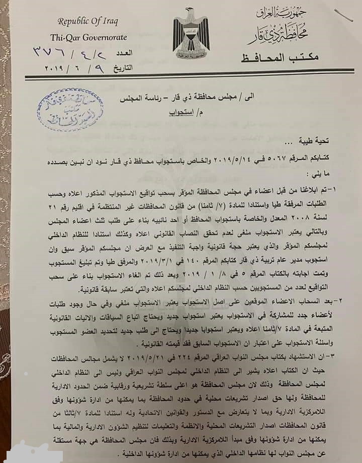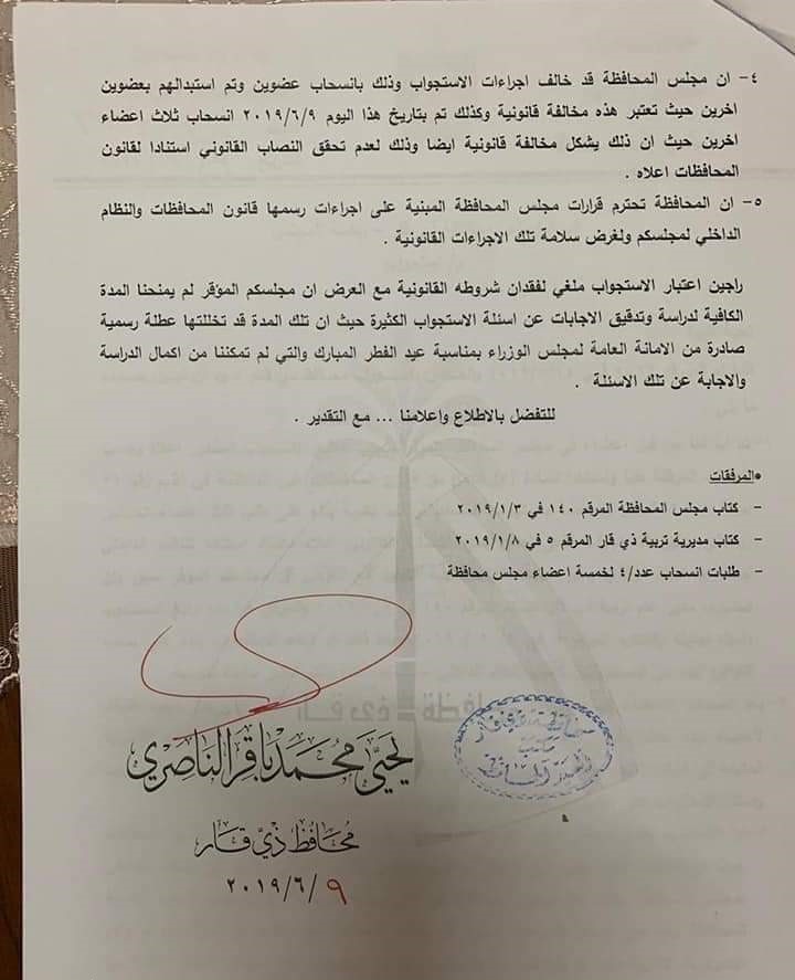 وجه محافظ ذي قار، يحيى الناصري، الإثنين، 10 حزيران، 2019، كتابا لمجلس المحافظة، طالب فيه بالغاء استجوابه لفقدان شروطه القانونية، على حد قوله.