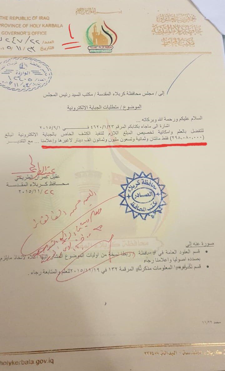 أظهرت وثائق عن فساد في أموال مشروع الجباية الإلكترونية بمحافظة كربلاء.