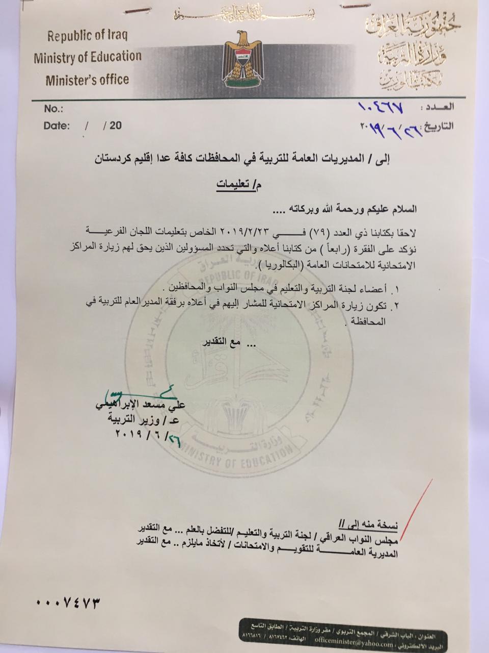 وذكرت الوزارة في وثيقة، ان "المسؤولين الذين يحق لهم الدخول إلى المراكز الامتحانية هم أعضاء لجنة التربية والتعليم في مجلس النواب والمحافظين".