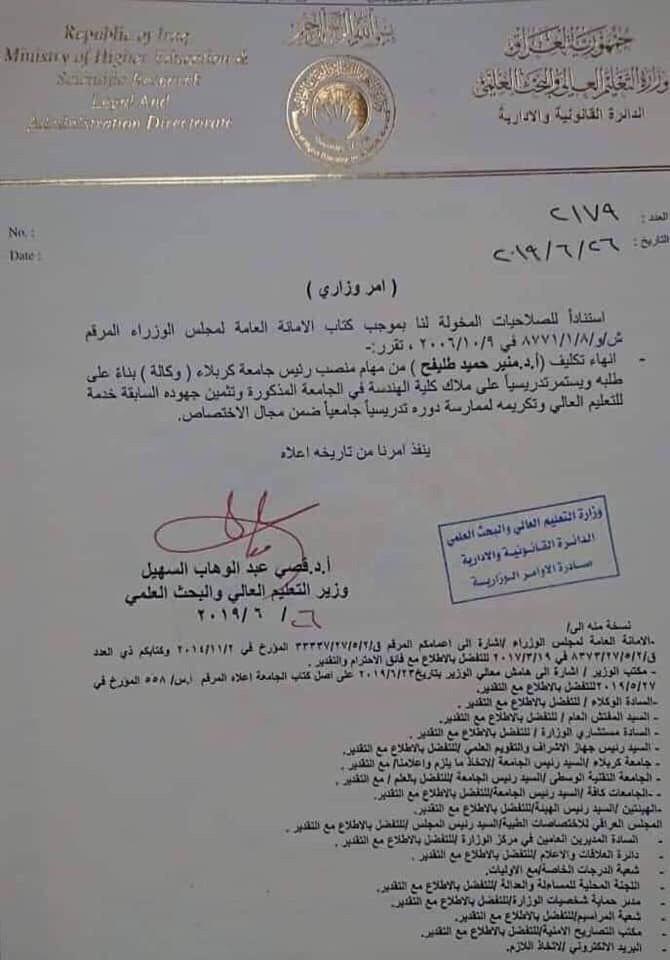 بالوثيقة.. انهاء تكليف رئيس جامعة كربلاء