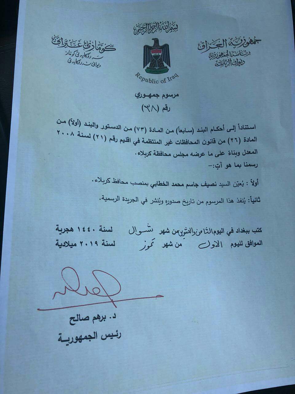 أصدر رئيس الجمهورية برهم صالح، الاثنين، مرسوماً جمهورياً يقضي بتعيين نصيف جاسم الخطابي محافظاً لكربلاء.