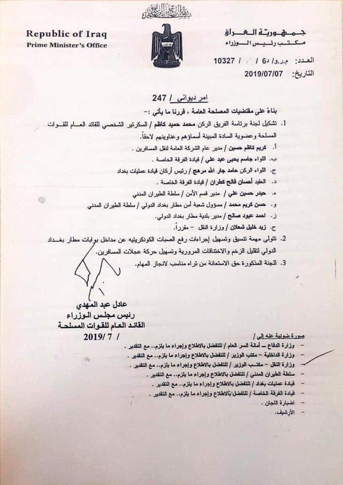 تنشر وكالة انباء براثا وثيقة موقعة باسم رئيس الوزراء عادل عبد المهدي تتضمن تشكيل لجنة حكومية لتسهيل رفع الحواجز الكونكريتية من مداخل مطار بغداد.