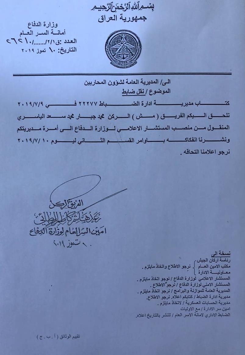 نشرت وثيقة صادرة من وزارة الدفاع تتضمن احالة المستشار الاعلامي للوزارة الفريق الركن محمد جبار محمد الياسري الى دائرة المحاربين.