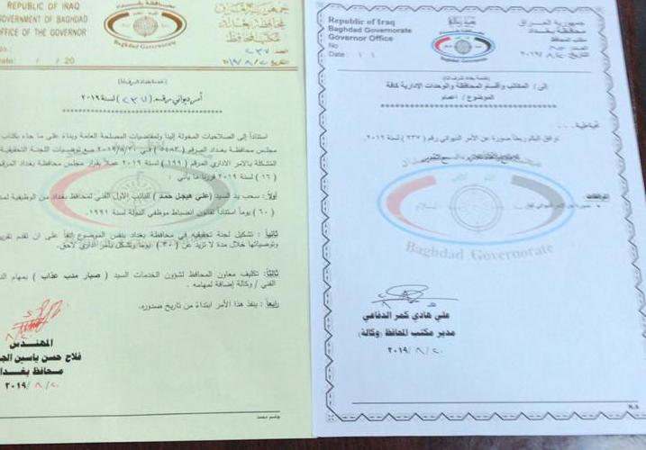 نشرت وثائق تشير الى سحب يد النائب الأول لمحافظ بغداد علي هيجل حمد لمدة 60 يوماً.
