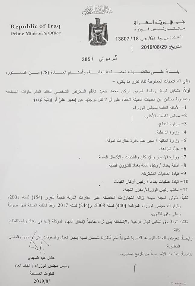 اصدر رئيس الوزراء عادل عبد المهدي، الاحد، امرا ديوانيا بتشكيل لجنة تزيل التجاوزات على عقارات الدولة.