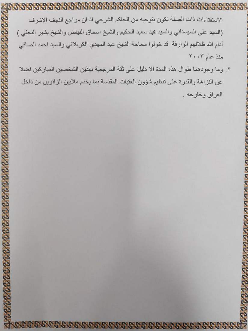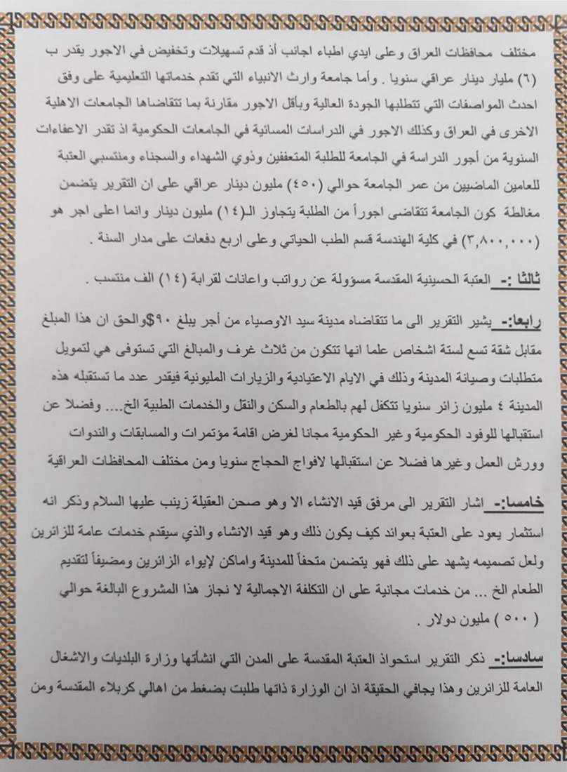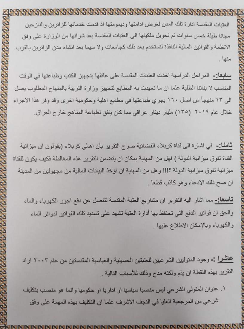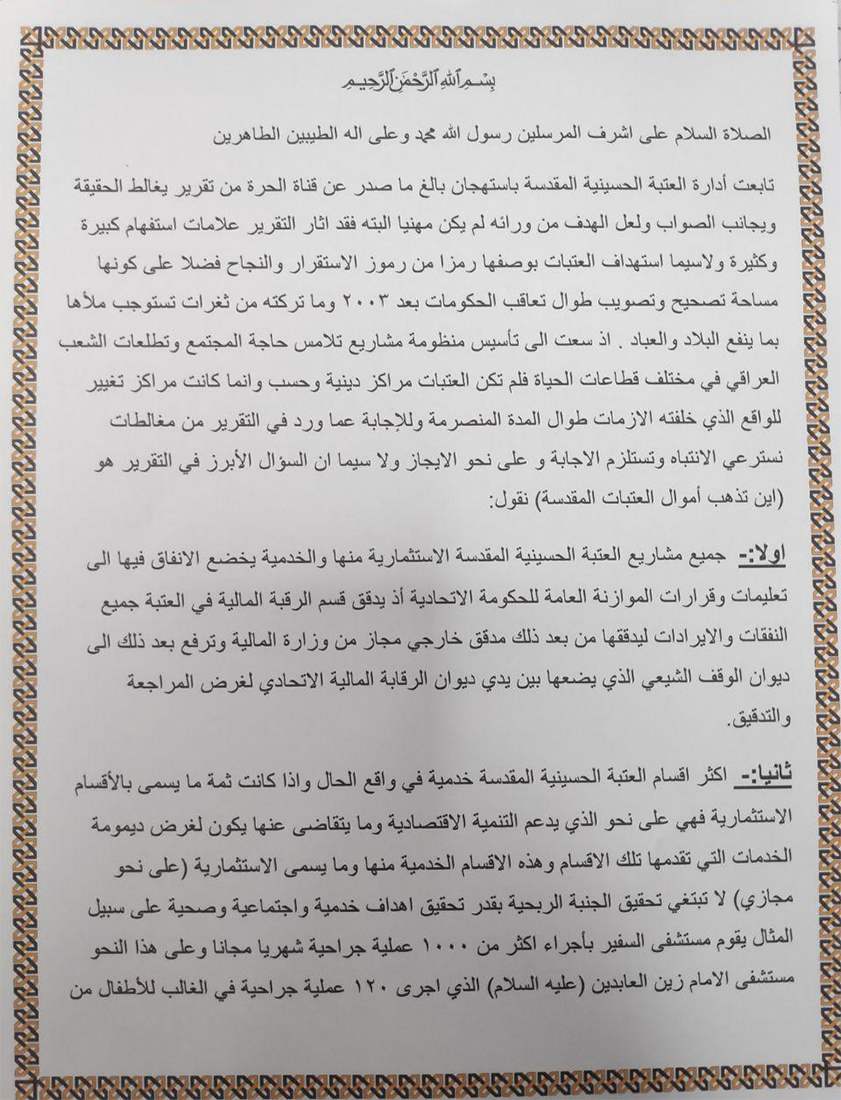 وجاء في وثائق نشرتها العتبة على موقعها إن "ادارة العتبة الحسينية المقدسة تابعت باستهجان بالغ ما صدر عن قناة الحرة من تقرير يغالط الحقيقة ويجانب الصواب ولعل الهدف من ورائه لم يكن مهنيا البته فقد اثار التقرير علامات استفهام كبيرة وكثيرة ولاسيما استهداف العتبات بوصفها رمزا من رموز الاستقرار والنجاح فضلا على كونها مساحة تصحيح وتصويب طوال تعاقب الحكومات بعد 2003".