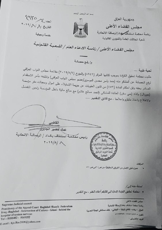 اصدرت رئاسة محكمة استئناف الرصافة قرارا طالبت الادعاء العام بمخاطبة مجلس النواب برفع الحصانة البرلمانية عن عضو لجنة النزاهة البرلمانية حمد ياسر الموسوي للمثول امام القضاء العراقي حول قضية استيلاء مجموعة مسلحة تابعة للموسوي على مقر واجهزة قناة فضائية عراقية مملوكة للاعلامي احمد الصالح