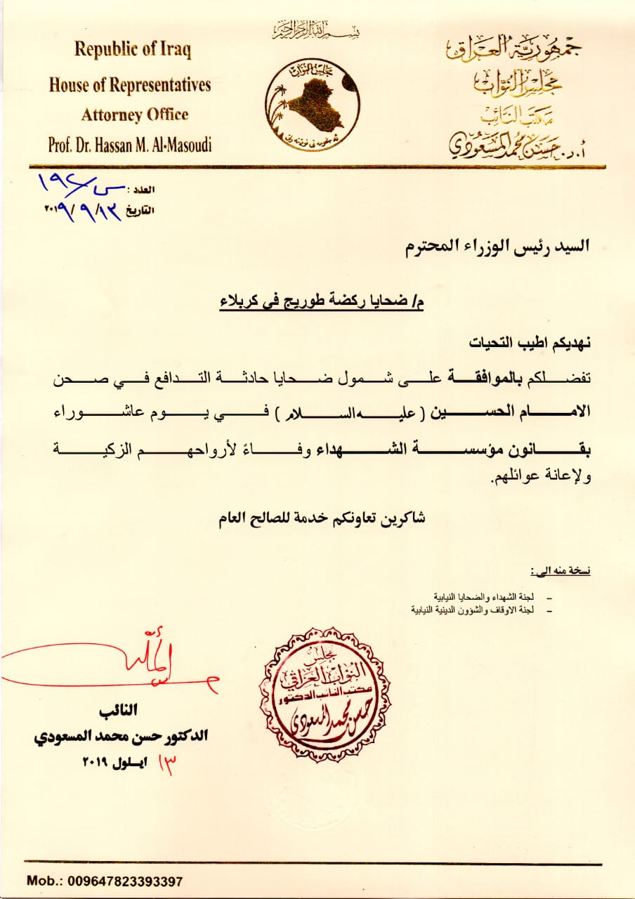 طالب النائب حسن المسعودي، الجمعة، رئيس مجلس الوزراء عادل عبد المهدي بالموافقة على شمول ضحايا حادثة التدافع في الصحن الحسيني في كربلاء بقانون مؤسسة الشهداء، معتبرا ذلك "وفاءً لارواحهم واعانة لعوائلهم".