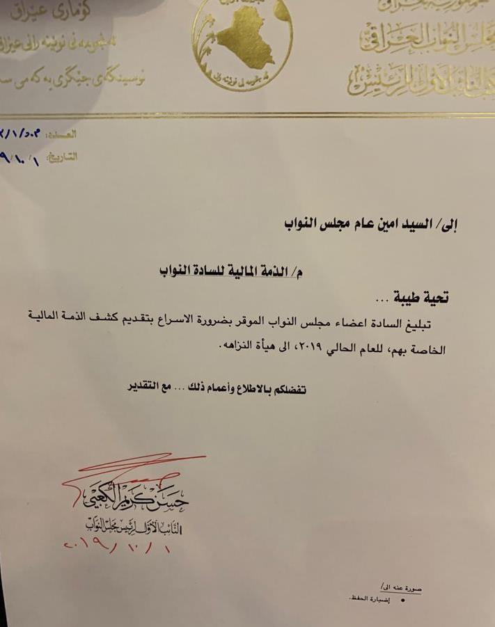 نشرت وثيقة تتضمن توجيهاً من النائب الاول لرئيس مجلس النواب حسن كريم الكعبي لأعضاء البرلمان بضرورة الاسراع بتقديم كشف الذمة المالية الخاصة بهم للعام الحالي ٢٠١٩ الى هيئة النزاهة.