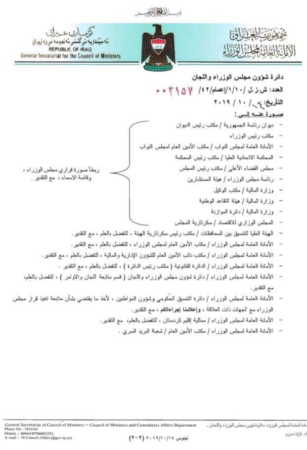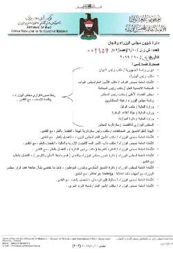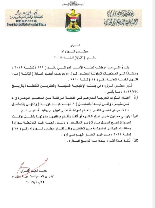 واظهرت الوثائق أنه "بناء على ما عرضته لجنة الأمر الديواني رقم (199) لسنة 2019، واستنادا الى الصلاحيات المخولة لمجلس الوزراء بموجب أحكام المادة (الثامنة) من قانون الخدمة المدنية رقم (29) لسنة 1960، قرر مجلس الوزراء في جلسته الإعتيادية السابعة والعشرين المنعقدة، اعفاء الذوات المدرجة أسماؤهم في القائمة المرافقة من المناصب المؤشرة إزاء كل منهم، والتي تبدأ بالتسلسل (1. نجم عبد عويد) وتنتهي بالتسلسل (61. حیدر ناصر ظاهر)".