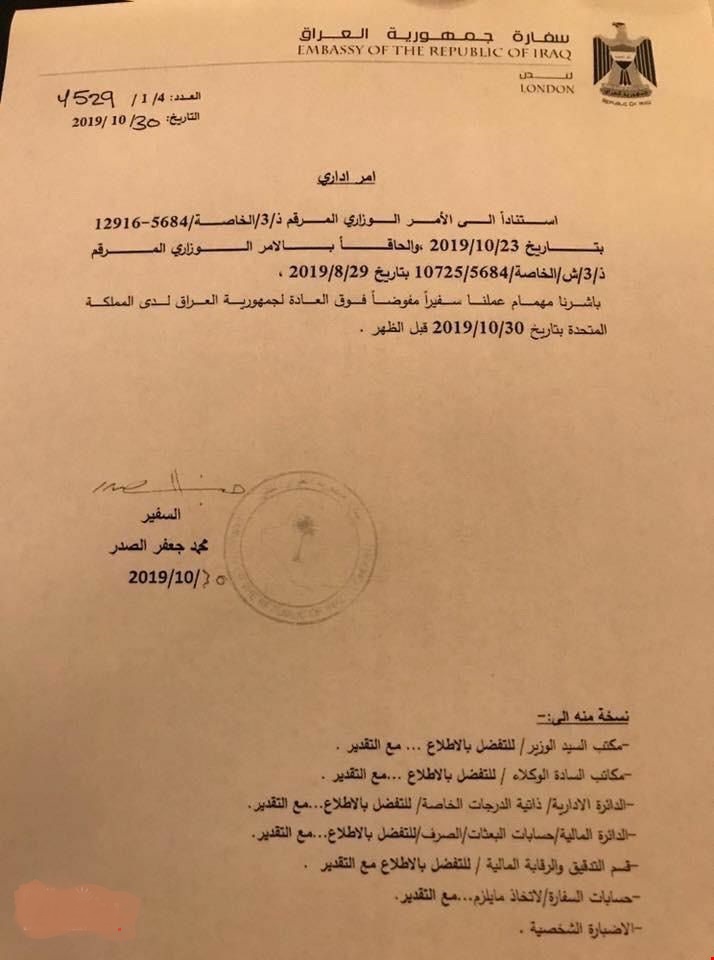 وبحسب الوثيقة التي صدرت، أنه "استناداً الى أمر وزاري، باشرنا مهام عملنا سفيراً مفوضاً فوق العادة لجمهورية العراق، لدى المملكة المتحدة البريطانية بتاريخ 30 تشرين الاول 2019 قبل الظهر".
