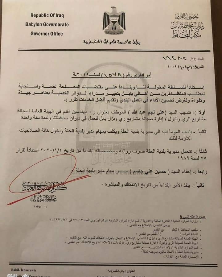 وبحسب وثيقة صادرة من مكتب محافظ بابل، فأنه "قرر اعفاء مدير بلدية الحلة حسين علي جاسم، من منصبه".