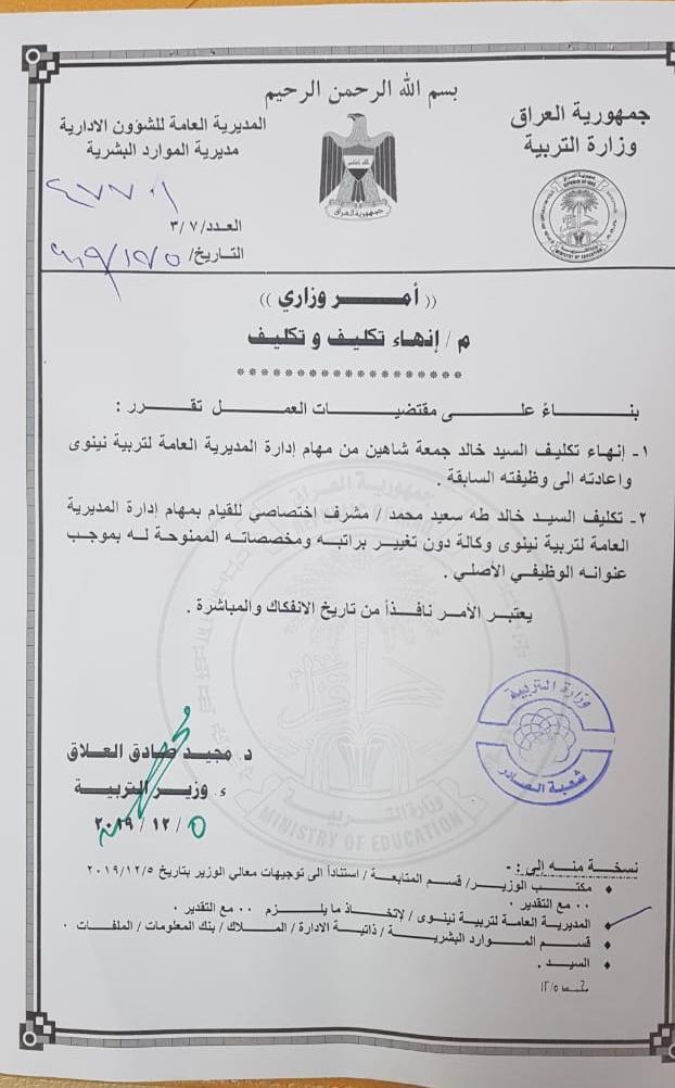 وتتضمن الوثيقة التي كشف عنها النائب عن محافظة نينوى احمد الجبوري انهاء تكليف خالد جمعة شاهين من مهام ادارة مديرية تربية نينوى، وتكليف خالد طه سعيد بمهام ادارة المديرية.
